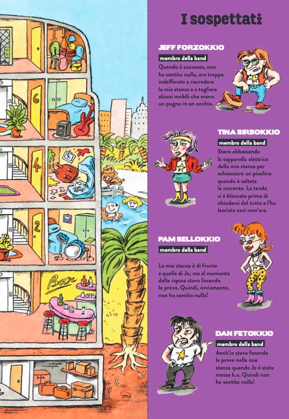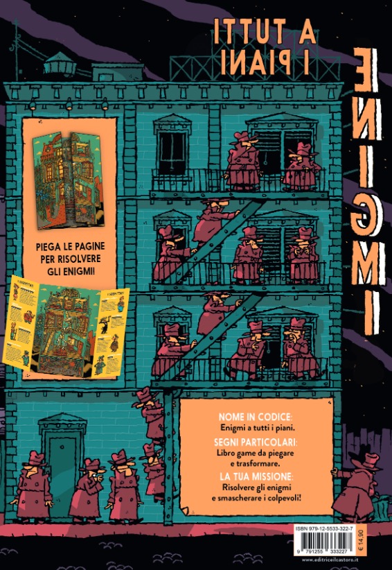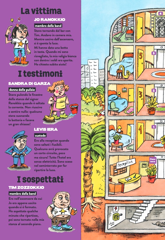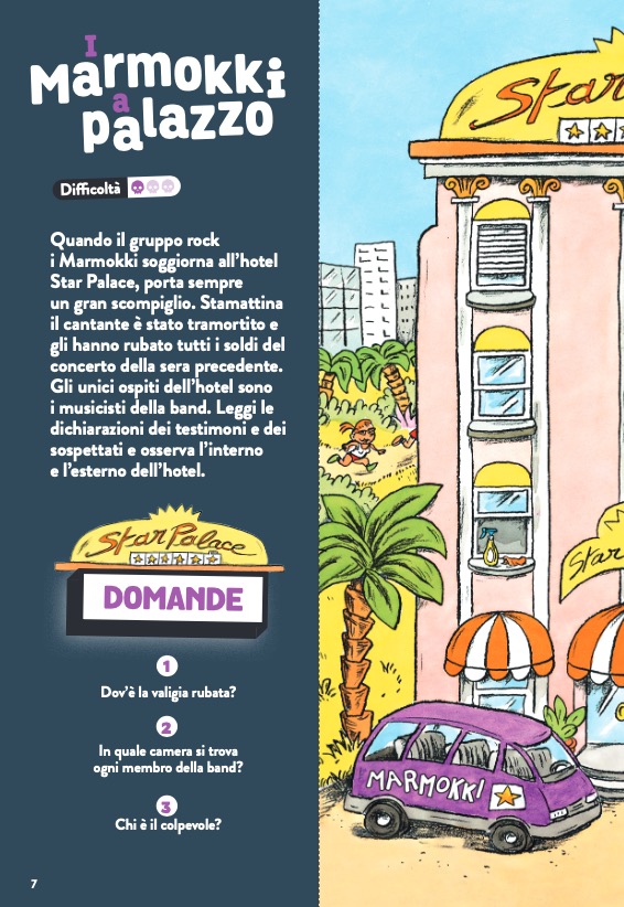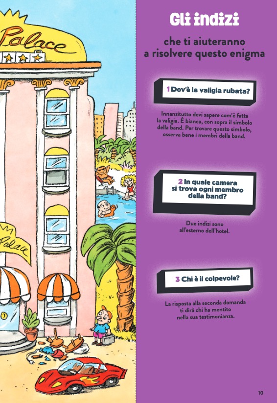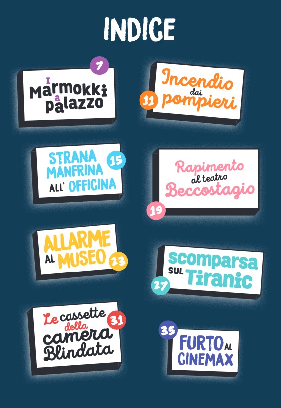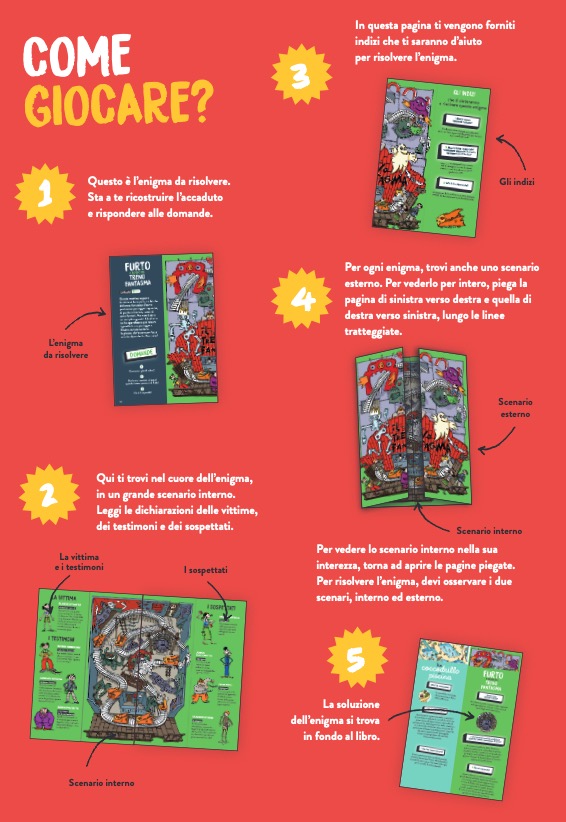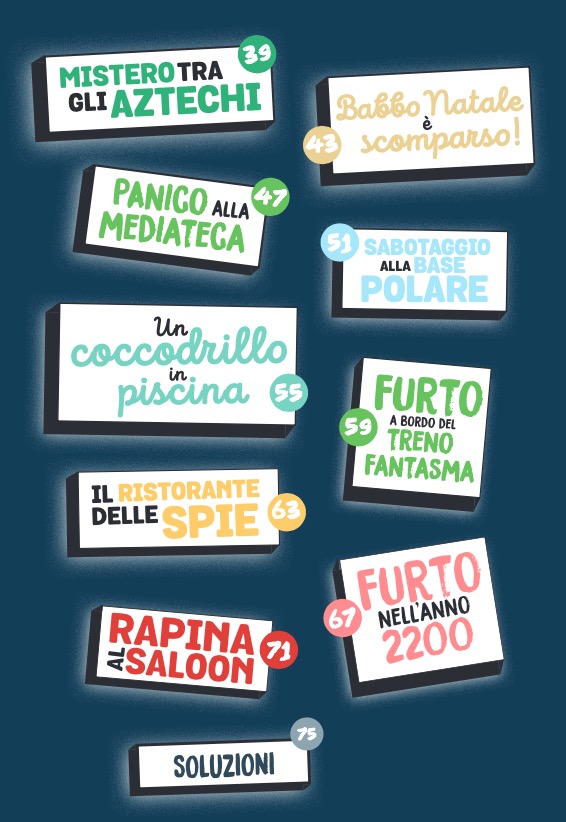 Un libro-gioco con un concept originale e unico: grandi doppie pagine da piegare che si trasformano ciascuna in un’indagine da compiere, per il piacere del lettore che si improvvisa detective. Dal furto del cantante di una improbabile rock band alla scomparsa di una grande attrice di teatro, passando per il sabotaggio di una base polare o la rapina di un saloon, il giovane lettore sarà portato a risolvere enigmi molto misteriosi, vivendo avventure in scenari molto particolari.
