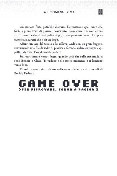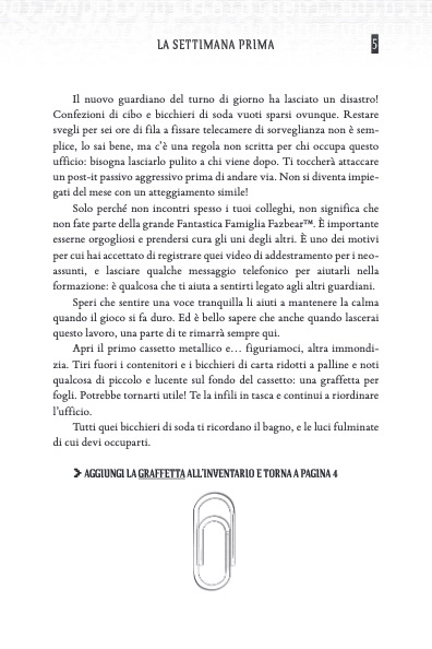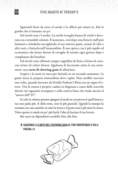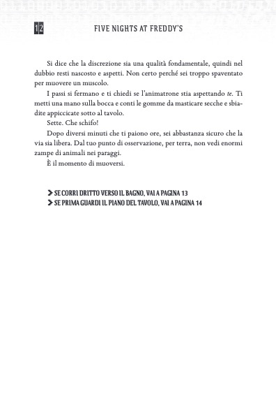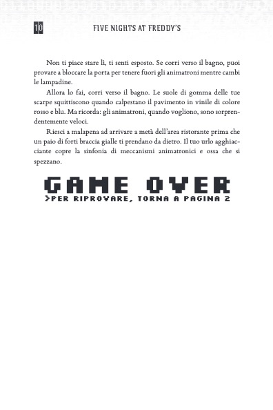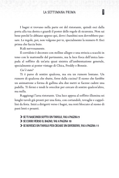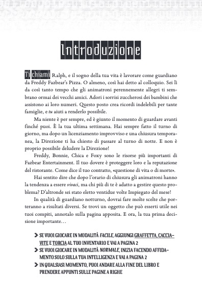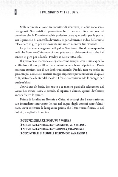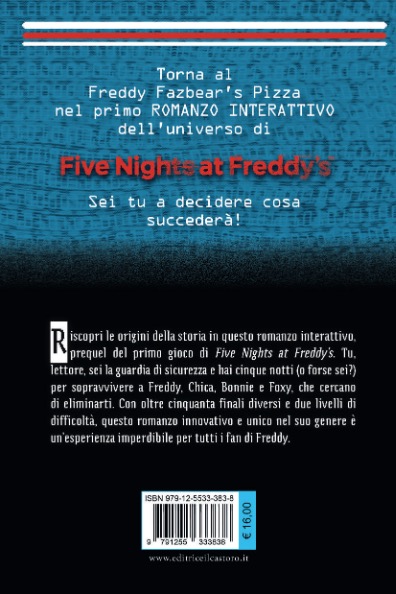 Tu, lettore, sei la guardia di sicurezza e hai cinque notti (o forse sei?) per sopravvivere a Freddy, Chica, Bonnie e Foxy, che cercano di eliminarti. Con oltre cinquanta finali diversi e due livelli di difficoltà, questo romanzo innovativo e unico nel suo genere è un’esperienza imperdibile per tutti i fan di Freddy.