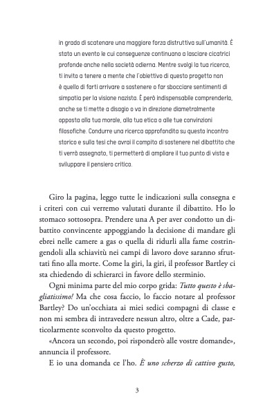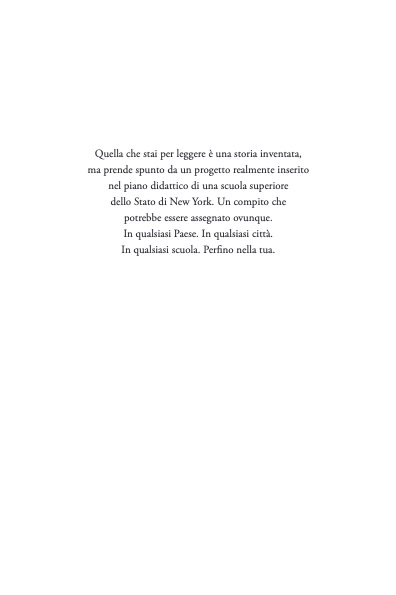 “Quella che stai per leggere è una storia inventata, ma prende spunto da un progetto realmente inserito nel piano didattico di una scuola superiore dello Stato di New York. Un compito che potrebbe essere assegnato ovunque. In qualsiasi Paese. In qualsiasi città. In qualsiasi scuola. Perfino nella tua.”