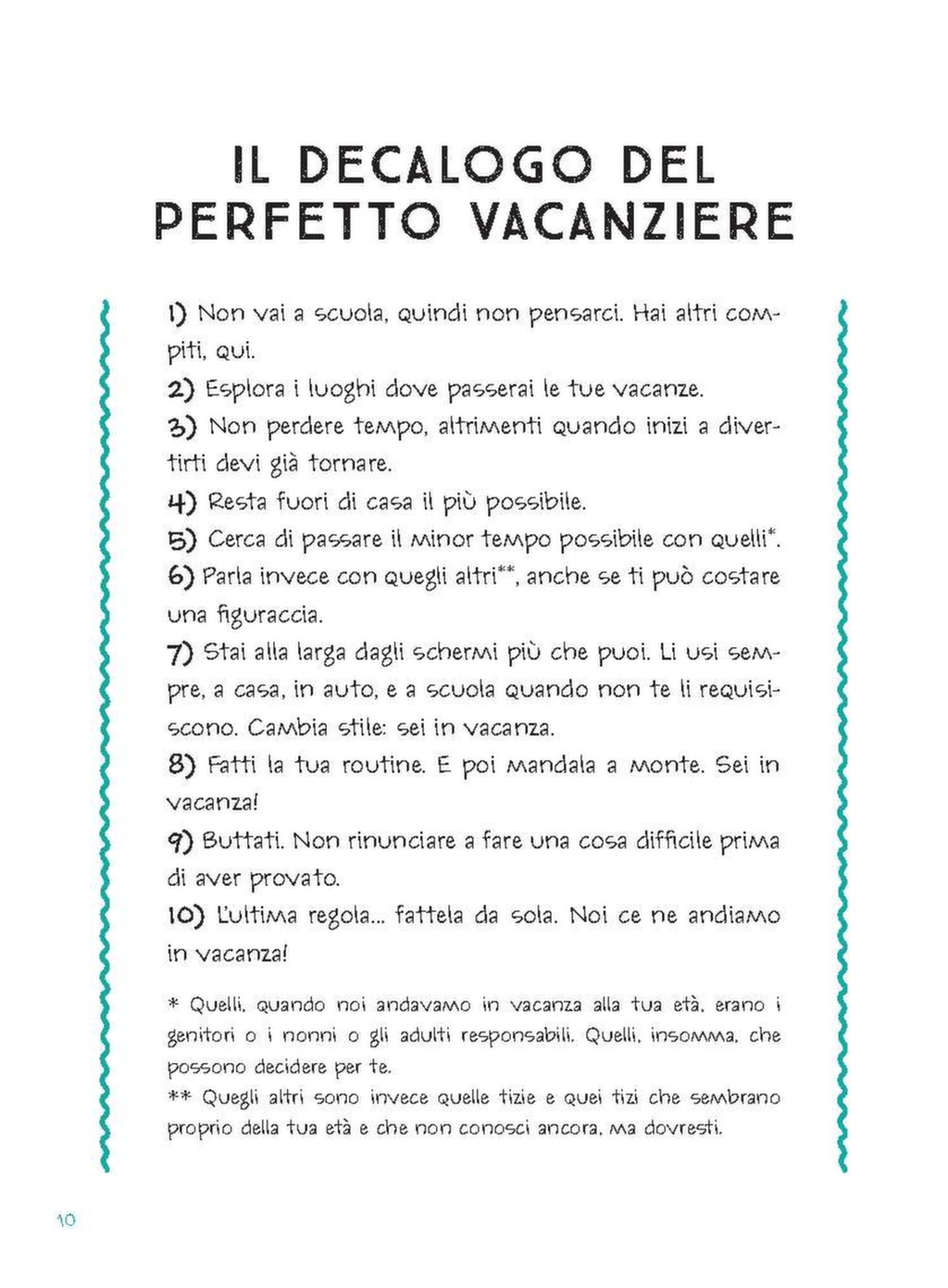 In vacanza non ci sono leggi, tranne una: devi assolutamente divertirti. Non importa quando o dove, importa come. Infatti non c’è momento migliore per fare tutte quelle cose che non puoi fare nella vita di tutti i giorni: esplorare, saltare, correre, scappare, entrare, uscire, conoscere, parlare, fare tardi, svegliarti presto, costruire, distruggere, spostare, cambiare e compiere tutte le imprese che ti vengono in mente, soprattutto le più folli. Perché sì, certo: un po’ di follia ci vuole, altrimenti che vacanza è?