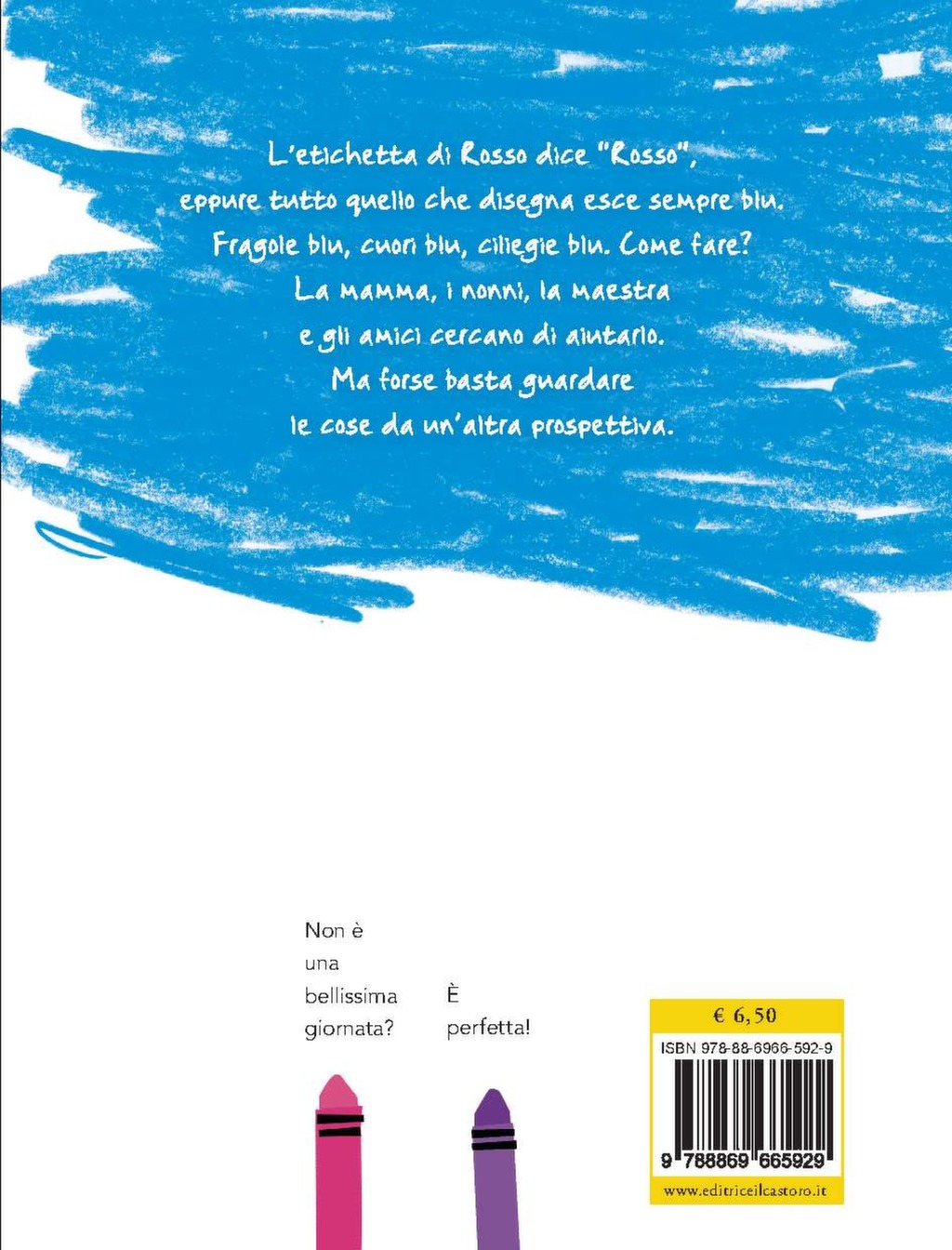 L’etichetta di Rosso dice “Rosso”, eppure tutto quello che disegna esce sempre blu. Fragole blu, cuori blu, ciliegie blu. Come fare? La mamma, i nonni, la maestra e gli amici cercano di aiutarlo. Ma forse basta guardare da un’altra prospettiva.