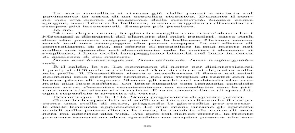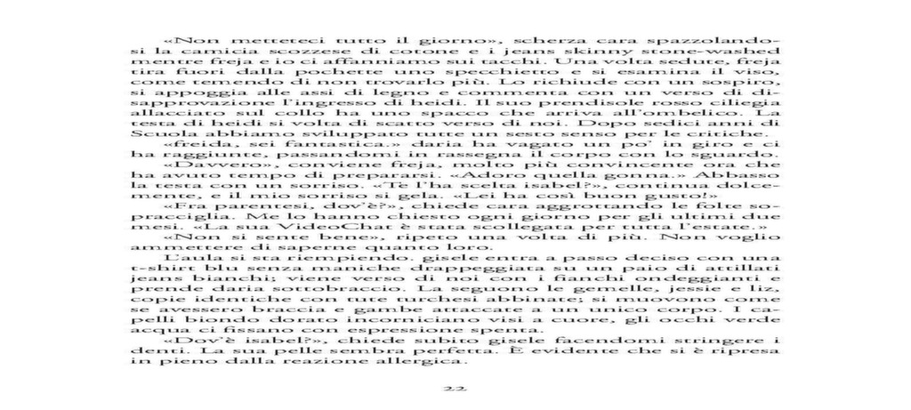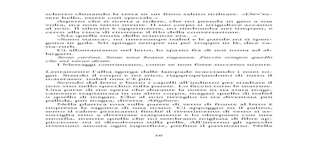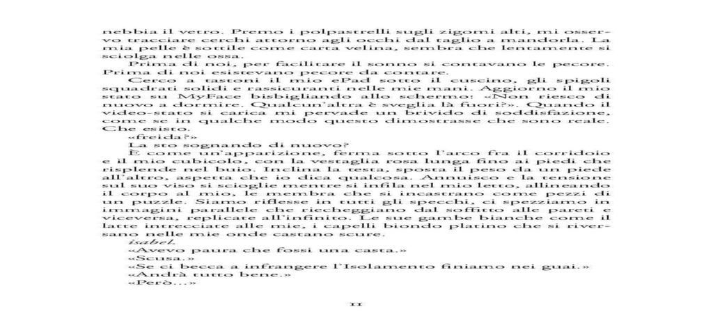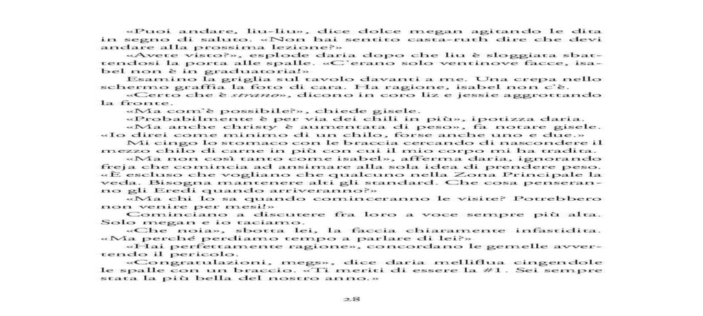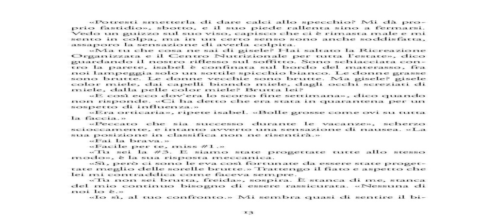 Sono sempre state amiche, freida e isabel. Ora hanno sedici anni, frequentano l’ultimo anno della Scuola e sono in attesa della Cerimonia dove sperano di essere scelte come compagne da uomini ricchi e potenti. L’alternativa è diventare concubine, o non essere scelte affatto e andare incontro a un destino terribile. Come tutte le altre ragazze, freida e isabel sono state prodotte in laboratorio e allevate con l’unico scopo di diventare perfette: la cura del corpo deve essere l’unica ragione di vita, il loro carattere deve essere socievole e disponibile. Ora che il momento sta per arrivare la pressione è fortissima. isabel mette a rischio la sua sfolgorante bellezza perché non vuole più sottostare alle regole di questo mondo spietato… Poi finalmente i ragazzi arrivano, in cerca della loro futura compagna. freida sa che deve combattere per il suo futuro, anche se per questo deve tradire la sua migliore amica, anche se significa innamorarsi quando è vietato, anche se sa che le conseguenze possono essere irreparabili…